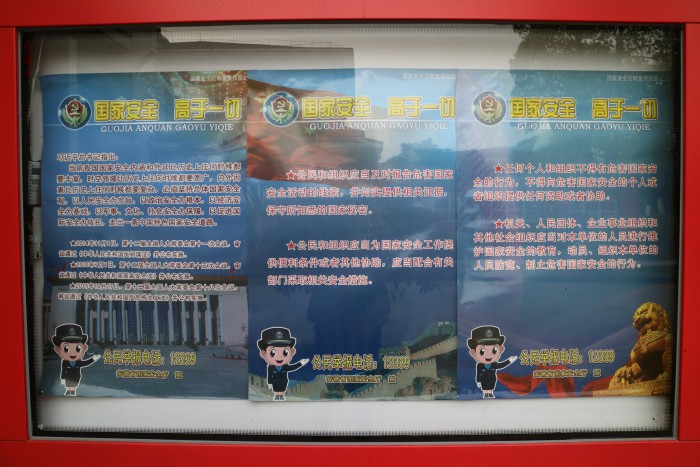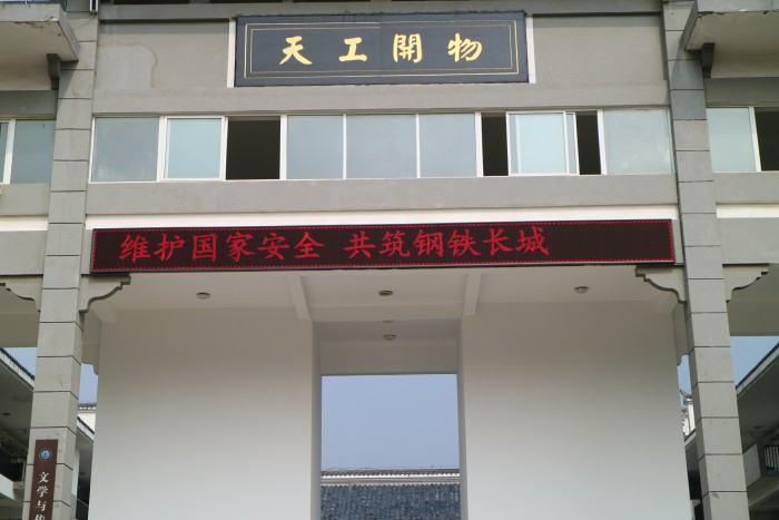 学校在宣传橱窗上张贴关于国家安全教育的宣传图,普及安全教育知识;在各教学楼前的电子屏滚动播放安全教育宣传语。